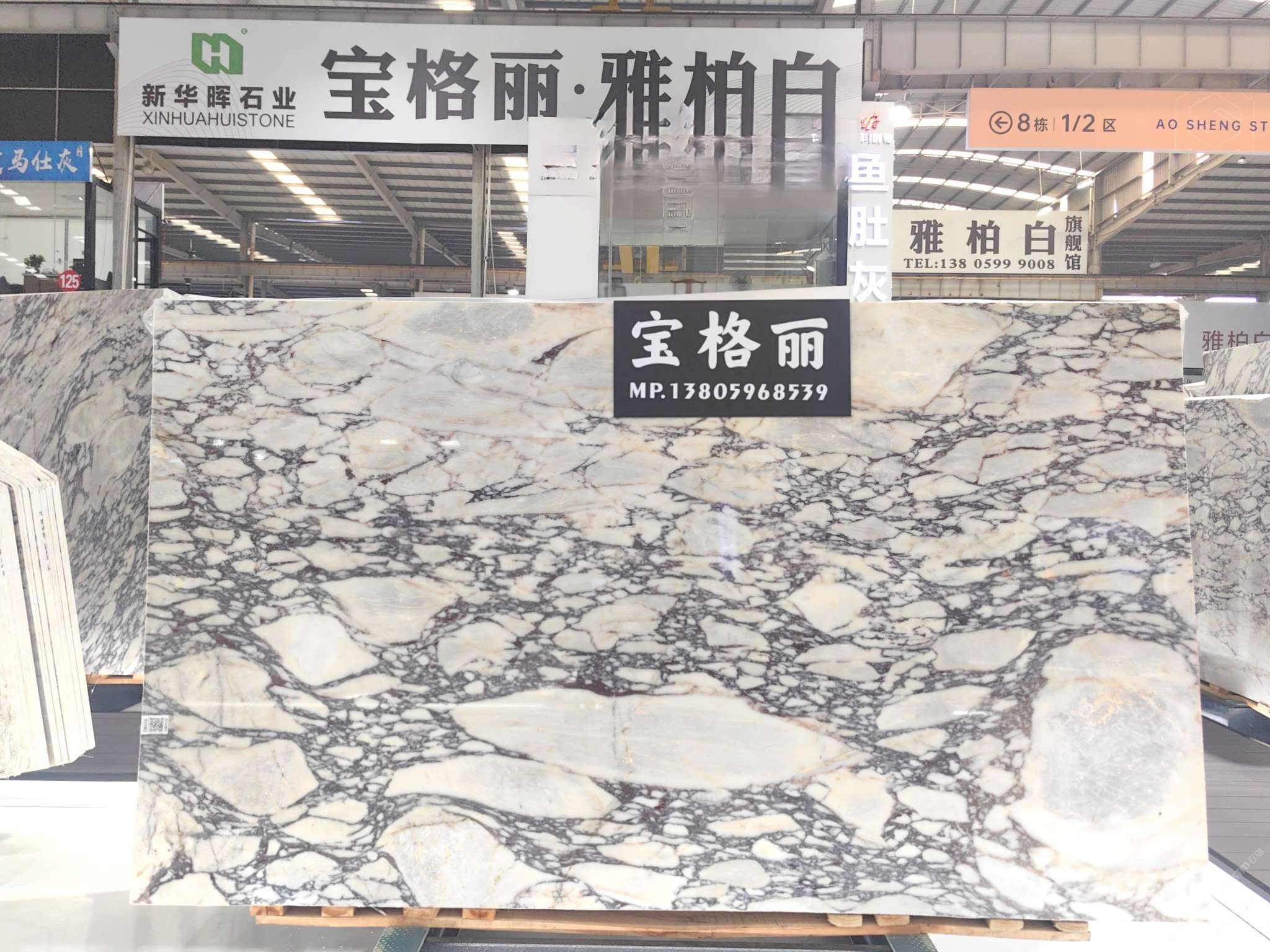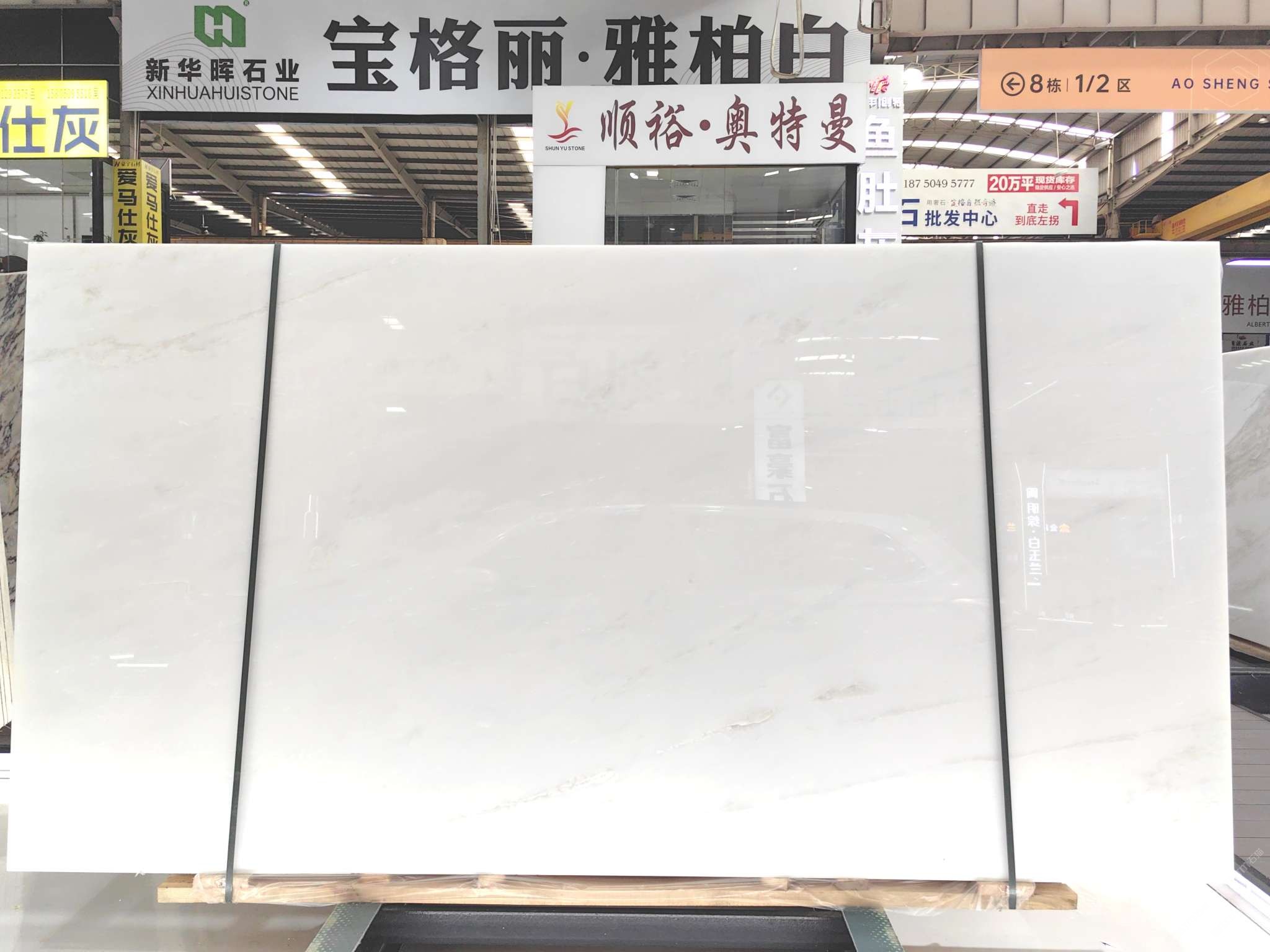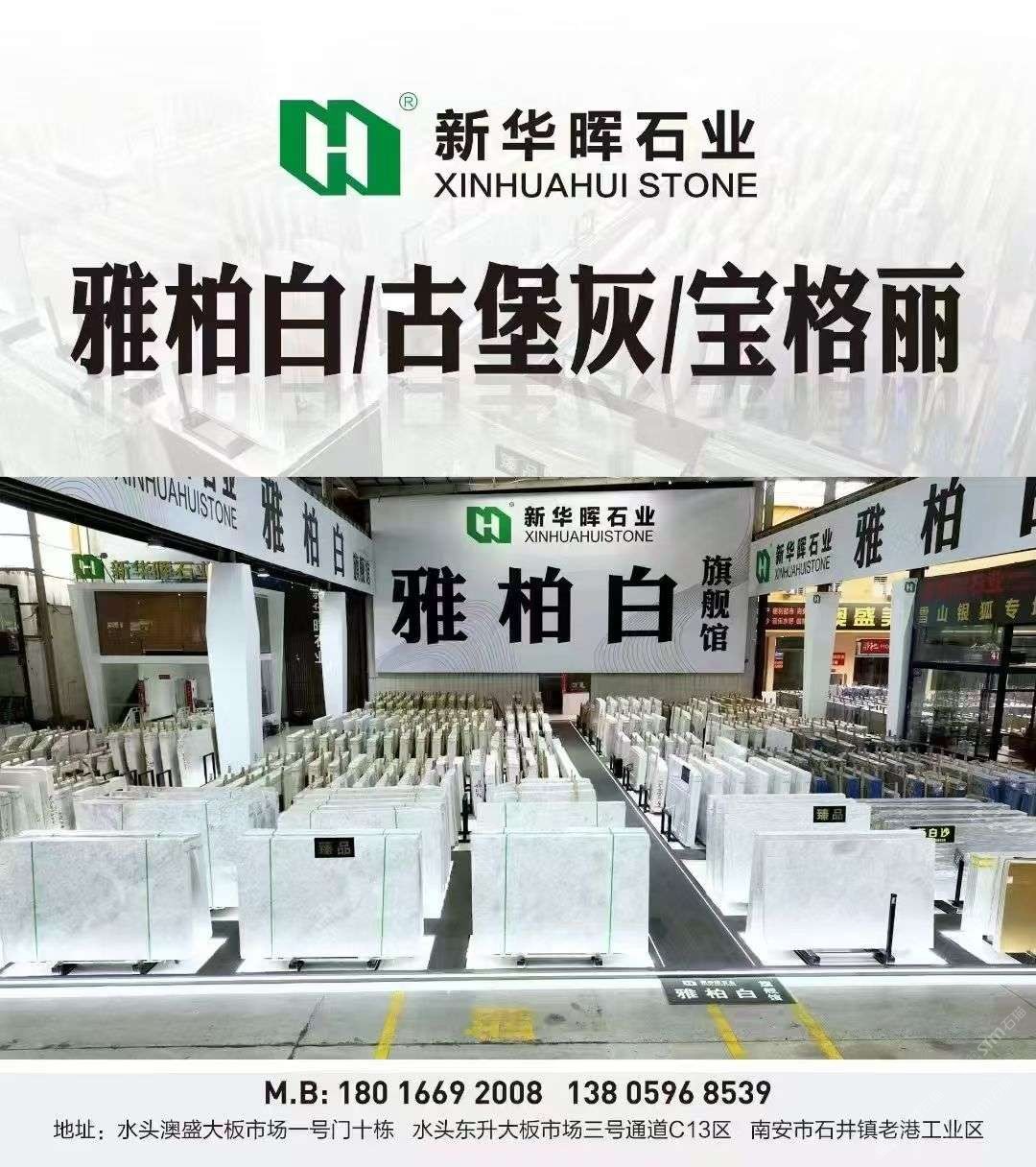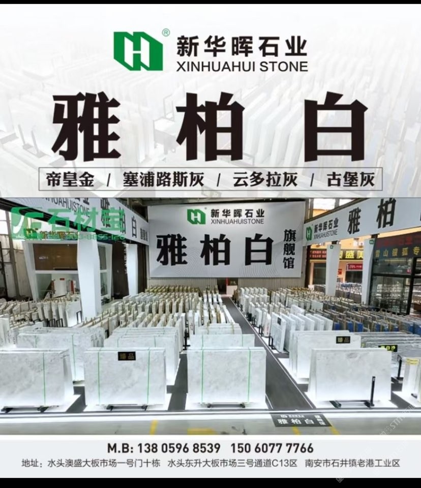福建南安【賣(mài)場(chǎng)地址】水頭鎮(zhèn)澳盛大板市場(chǎng)2號(hào)門(mén)直走8棟新華暉白石空間