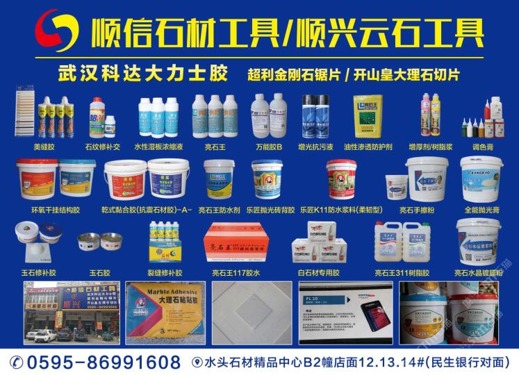 南安市順信石材工具有限公司成立于1999年,位于有“中國石材城”之稱的福建省南安市水頭鎮(zhèn)閩南建材市場(chǎng)內(nèi),分設(shè)石材工具護(hù)理部、干掛部?jī)蓚€(gè)門市部,是一家批發(fā)、零售兼營的石材配套工具。多年來,憑借產(chǎn)品的齊全、質(zhì)量的保證、信譽(yù)的可靠、服務(wù)的周到,本商行在國內(nèi)同行中已形成自己的地位和影響,并擁有龐大的客戶群體,產(chǎn)品銷至國內(nèi)各大石材生產(chǎn)基地。我們代理的品牌有:武漢科達(dá)大力士膠、環(huán)氧膠、化學(xué)錨栓、干掛膠、植筋膠等產(chǎn)品系列;亮石王防護(hù)劑、防古水、水晶膠、樹脂膠、友豐比利蠟等產(chǎn)品;粵邦消紋劑、染色劑、百亮鋼絲棉、百潔墊;旗魚、非爾、柏興、順輝、背栓螺絲;各種款式干掛件、幕墻材料輔助產(chǎn)品;磨料磨具品牌有益和、超利、順興、閩福、芒果、金山、金鋒、智輝等;進(jìn)口、國產(chǎn)防古刷、亞光磨料、大理石磨料;意大利開山皇大理石刀具、微晶石刀具、電鍍切片、超利金鋼石切割片、軟磨片、翻新片、金鋼盤、樹脂盤;大小規(guī)格刀具、鉆頭、雕刻工具齊全;金鋼石異形輪、石材夾具、吊具、吊繩、勞保用品;電動(dòng)工具、氣動(dòng)工具、銅條、鋼條、合金工具等各種各樣產(chǎn)品齊全。