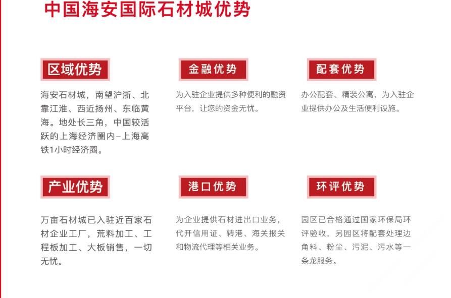 項目得到當?shù)卣拇罅χС?,投入基礎設施20億元,主干道雙向六車道已全面通車,綠化、官網、路燈、水電等七通一平已全部到位,達到一級城市主干道水平。石材城總占地面積15000畝,一期占地面積3000畝,規(guī)劃總建筑面積約138萬平方米,于2013年1月18日全面開工建設,目前已有80多家企業(yè)正式投產。