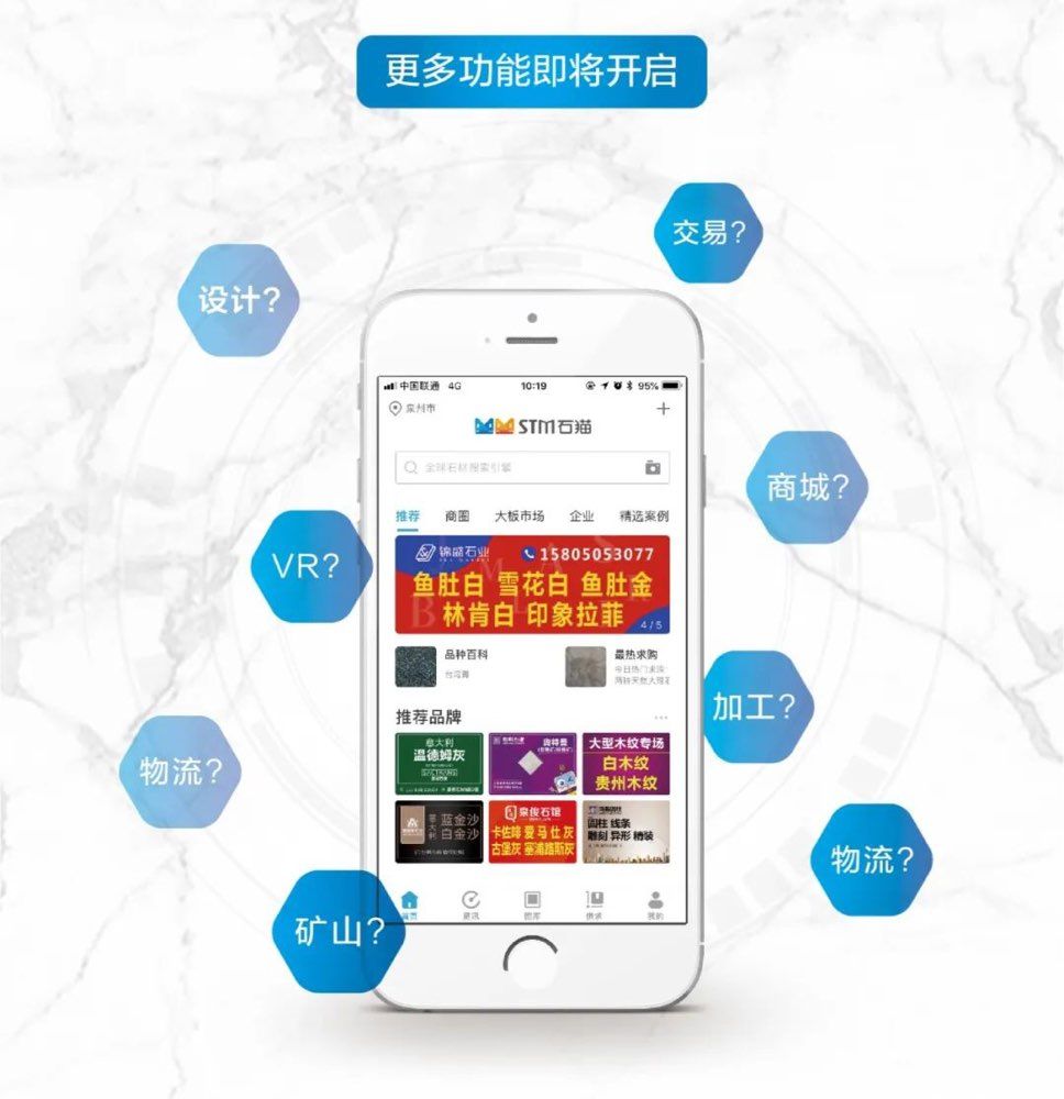 石貓獨(dú)立自主研發(fā)的APP客戶端,是一款基于石材大數(shù)據(jù)的信息篩選及高效匹配,為企業(yè)提供精準(zhǔn)的互聯(lián)推廣,為用戶提供簡(jiǎn)單、實(shí)效的選材體驗(yàn),并讓雙方在線上實(shí)現(xiàn)信息交互的石材APP。我們以“不斷改變?nèi)藗儗?duì)石材的搜索習(xí)慣”為發(fā)展理念,通過(guò)五年的積累沉淀,現(xiàn)已發(fā)展成為石材應(yīng)用?APP領(lǐng)域的者。目前平臺(tái)已經(jīng)具備石材行業(yè)的超大流量,以“用戶多、搜索快、品種全、覆蓋廣”占據(jù)著石材互聯(lián)網(wǎng)應(yīng)用的主要份額。2020年,石貓APP即將迎來(lái)一往無(wú)前的版本更新,這次突破更新將給你不一樣的石貓~