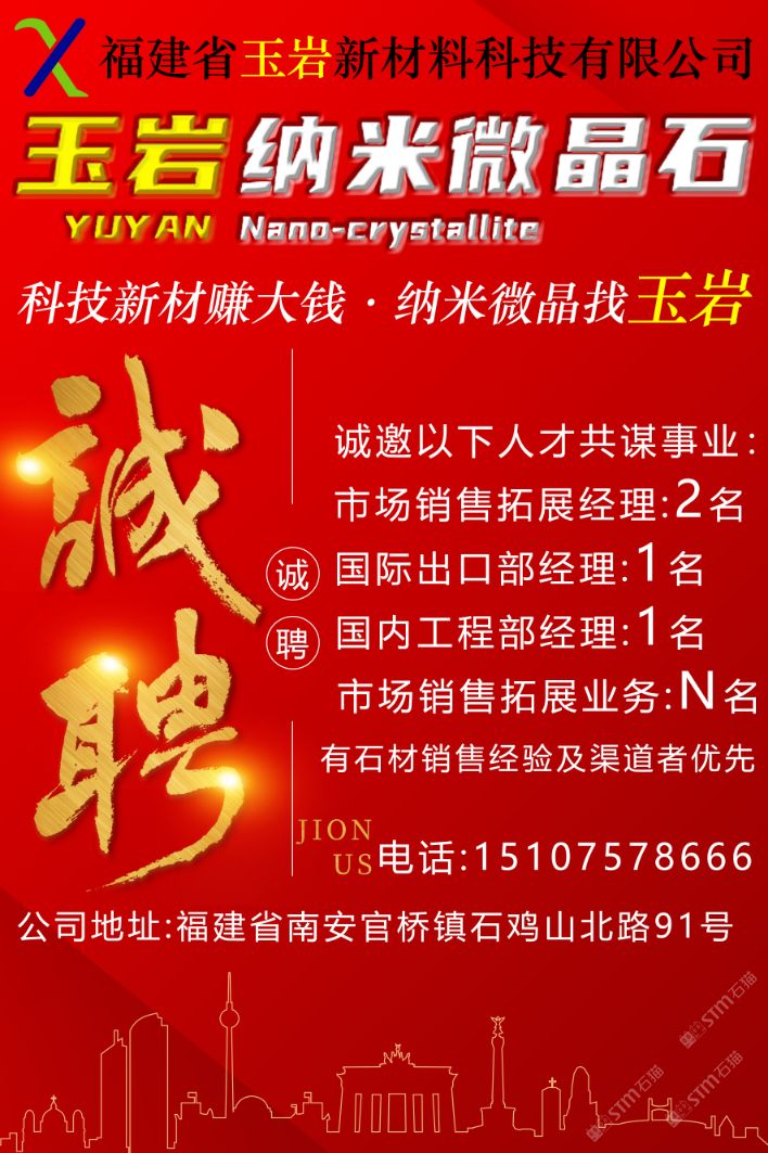 發(fā)布信息: 福建省玉巖新材料科技有限公司 科技新材賺大錢?納米微晶找“玉巖” 產(chǎn)品名稱:巖熔玉石 學(xué)術(shù)名稱:納米微晶石 產(chǎn)品特性: 一零:零輻射 二防:防滑;防污 三耐:耐磨;耐酸堿;耐高溫 四可:可透光;可回收;可熱彎;可加熱。 企業(yè)使命:推動環(huán)保建材,共建美好未來。 企業(yè)愿景:融納米微晶石,塑匠心玉巖魂。 企業(yè)價值觀:感恩奉獻,成人達己,科技創(chuàng)新,精益求精。 生產(chǎn)廠家: 福建省中郡莊藝新材料科技有限公司榮譽出品。