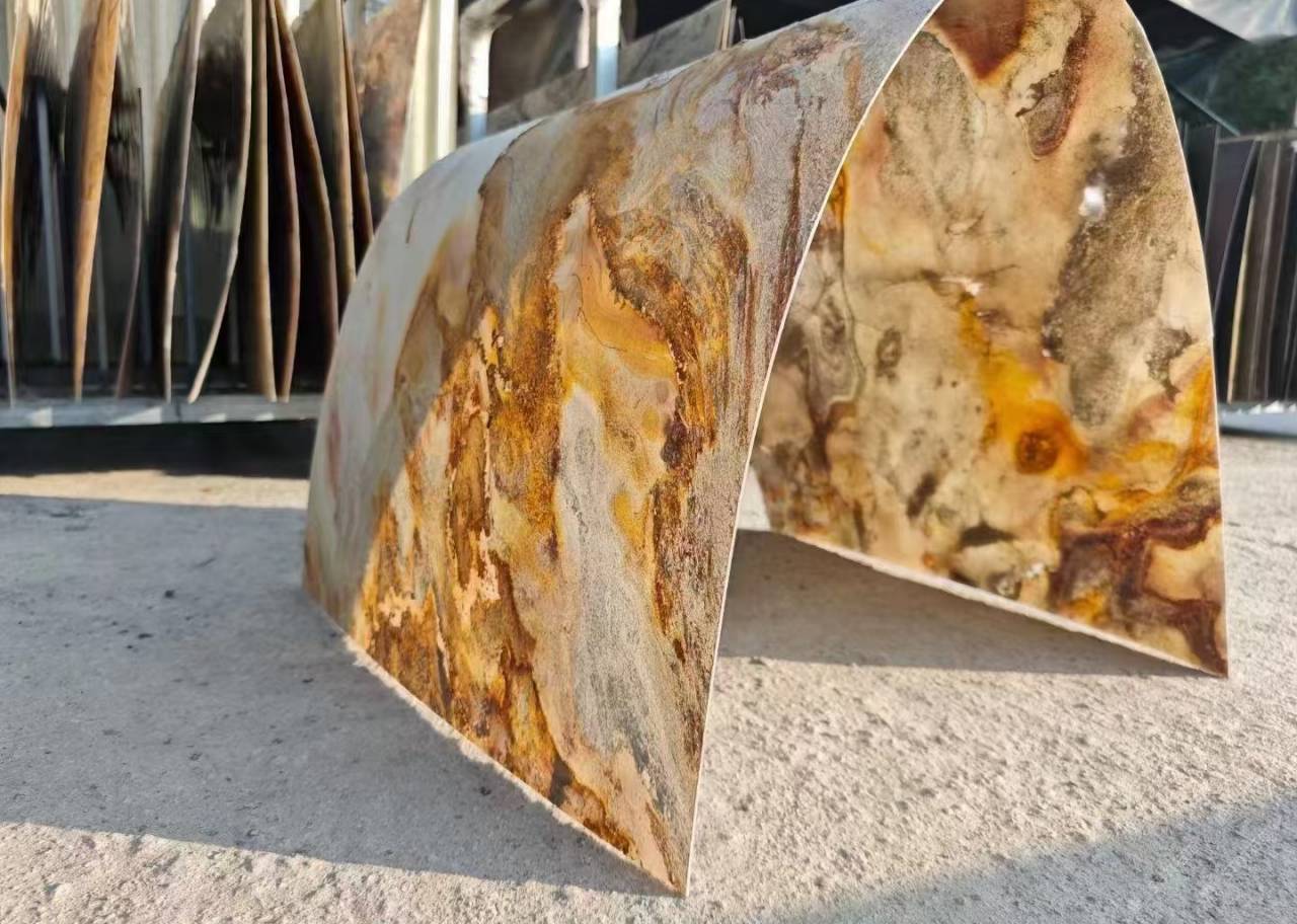 描述:是將天然大理石切割為0.8-1.2mm厚度,實(shí)現(xiàn)大理石復(fù)合后的超輕超薄可彎曲效果。改變了石材的物理性能,達(dá)到可以彎曲造型的效果,可以更大化實(shí)現(xiàn)設(shè)計(jì)師的設(shè)計(jì)想法,表面啞光工藝處理、圖案蝕刻處理、曲面弧面處理等均可實(shí)現(xiàn)。